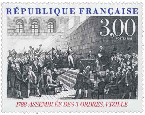 | Description | Bicentenaire de la Révolution. Philexfrance 89. Exposition philatélique mondiale. Représentation de l'assemblée des 3 ordres en 1788 au château de Vizille dans l'Isère (opposition du tiers état aux tentatives de réformes du cardinal de Brienne) |