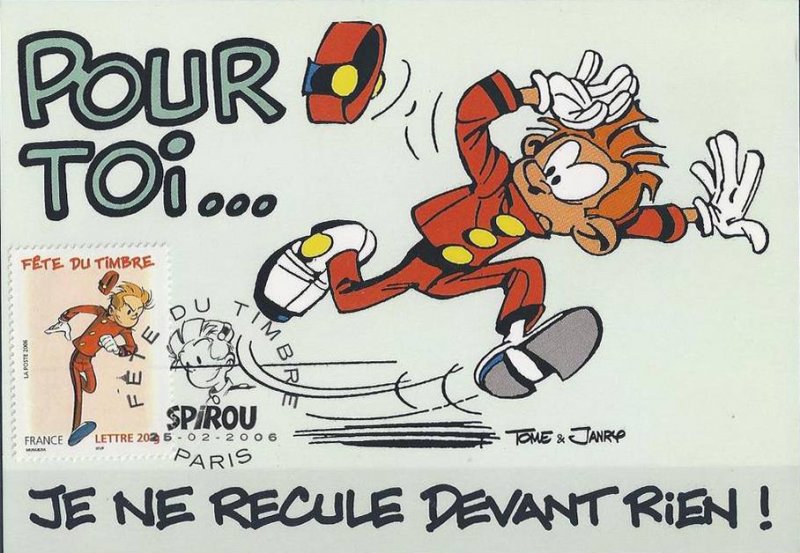 | Commentaire | Les timbres Spirou seront émis en 2006 dans la série « Fête du timbre » qui met à l’honneur les héros de bande dessinée depuis 1999. De 1938 à 1998, cet aventurier aux costume de groom a évolué sous la plume de Bob Vel, Jijé, Franquin, Fournier, Nic Broca, Chaland, Tome et Janry. Depuis 2004, Munuera pour le dessin et Morvan pour le scénario ont donné un nouveau souffle à Spirou. |