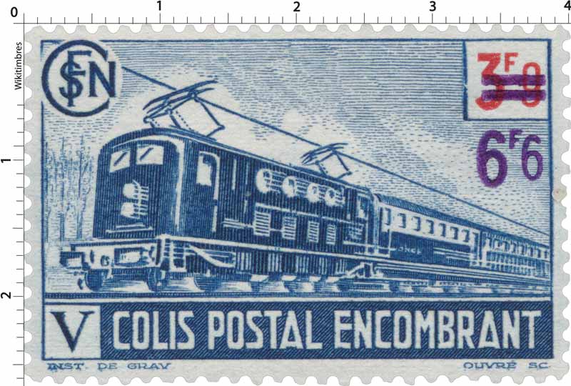 Timbre : 1943 COLIS POSTAL encombrant Mesures Format d'imp 37 x 23 mm Dents incluses 40 x 26 mm Forme horizontal Phosphore Non Impression Taille-douce Complément xxxxx Couleur bleu Valeur 6f6 Dentelure - Emis en - Quantité - Auteurs Dessinateur Ouvré Graveur Institut de Gravure Mise en page xxxxx Mentions Création d' Ouvré Numéros & Dates N° Philatelix - N° Michel - Date d'émission 01/01/1943 Date de retrait - Classements Groupe Colis postaux 1943 Catégorie Colis postaux Familles Usage - Régions - Départements - Description Colis postaux, Commentaire - Mes timbres & notes personnelles www.wikitimbres.fr