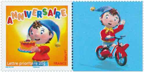 | Description | Timbre pour anniversaires. Depuis 2002, est utilisé un personnage de la fiction jeunesse : Oui-Oui tient un gâteau orné d'une bougie |
