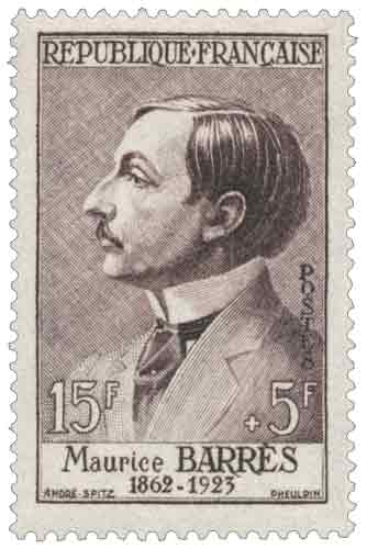 | Commentaire | Ce timbre-poste français de 1956 rend hommage à Maurice Barrès (1862-1923), écrivain, essayiste et homme politique, figure majeure de la vie intellectuelle française de la fin du XIXᵉ et du début du XXᵉ siècle. Émis dans la série Personnages célèbres grevée d’une surtaxe au profit de la Croix-Rouge française, il s’inscrit dans une volonté de mettre en valeur les grandes figures des arts et des lettres qui ont contribué au rayonnement culturel de la France. Né à Charmes, dans les Vosges, Barrès développe très tôt une œuvre marquée par la sensibilité, l’introspection et l’attachement aux racines, avant d’élargir sa réflexion à une conception de la nation fondée sur la continuité historique, les traditions et l’enracinement des individus dans leur terre natale. Du Culte du moi à La Terre et les Morts, son parcours littéraire traduit une évolution de l’individualisme vers une pensée collective et patriotique, qui influencera durablement le débat intellectuel de son temps. Académicien français à partir de 1906, Barrès occupe une place centrale dans la vie culturelle et politique de la Troisième République. Le timbre, dessiné par André Spitz et gravé en taille-douce par Jean Pheulpin, restitue avec sobriété les traits de l’écrivain, dans un style conforme à l’esthétique classique de la gravure postale française des années 1950.