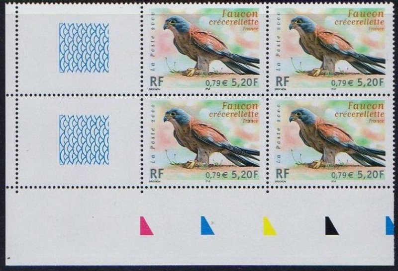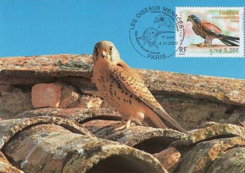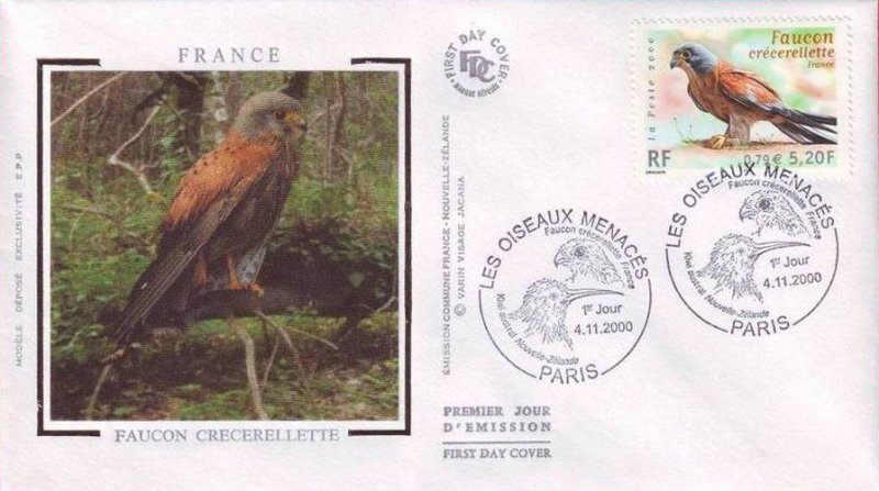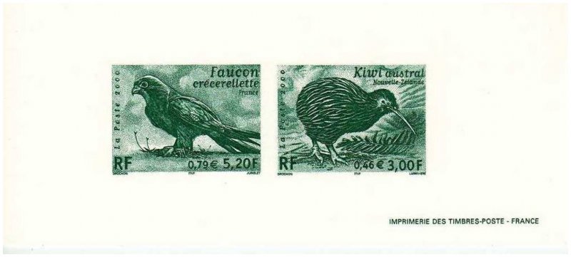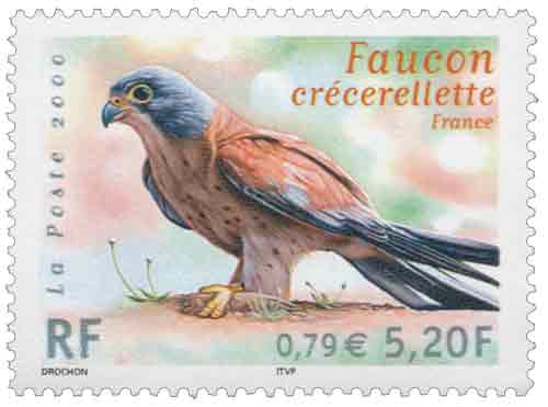 | Commentaire | Description synthétique du visuel du timbre : Les oiseaux se trouvent souvent au sommet des chaînes alimentaires, ce qui les rend sensibles aux perturbations des écosystèmes. Pour cette raison, ils sont devenus les indicateurs de santé de notre environnement et les effectifs d’une espèce traduisent le bon état ou au contraire l’altération des milieux naturels. L’avenir des espèces menacées est une préoccupation commune à la Nouvelle-Zélande et à la France. Pour cette raison deux oiseaux ont été retenus pour illustrer l’émission commune de l’année 2000. Le faucon crécerellette (Falco naumanni) ne niche plus aujourd’hui que dans la plaine de la Crau, dans les Bouches du Rhône. D’une taille d’environ 30 cm, il se nourrit essentiellement d’insectes et plus particulièrement de courtilières. Émission commune avec la Nouvelle-Zélande |