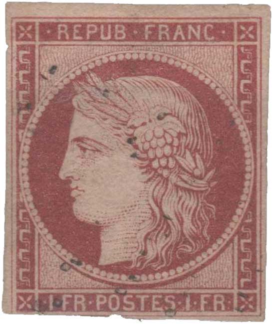 | Commentaire | remplacement septembre 1853 Voir la vidéo "Histoires de timbres" En savoir plus sur Wikipédia : Cérès Émis en 1849, le 1 franc carmin-brun appartient à la première série des timbres Cérès mise en circulation lors de la réforme postale du 1ᵉʳ janvier 1849. Cette valeur correspond au tarif des lettres de plus de 15 g et jusqu’à 100 g, circulant entre deux bureaux de direction, et constitue l’affranchissement le plus élevé utilisé pour les envois lourds ou les courriers nécessitant un port important. Comme l’ensemble de la série, il porte l’effigie républicaine de Cérès, dessinée et gravée par Jacques-Jean Barre, et est imprimé en typographie à plat sous la direction d’Anatole Hulot à la Monnaie de Paris. Cette nuance carmin-brun dérive des tirages du 1 franc carmin et s’inscrit dans la variété des teintes rencontrées pour cette forte valeur, liée aux conditions d’encrage et aux pratiques d’impression de la période. Le 1 franc carmin-brun reste en usage jusqu’en 1853, date à laquelle il est remplacé par la valeur équivalente au type Président Louis-Napoléon Bonaparte. Sa fonction tarifaire élevée, combinée à une diffusion naturellement plus limitée que celle des petites faciales, en fait une pièce représentative des grands ports de la IIᵉ République. |