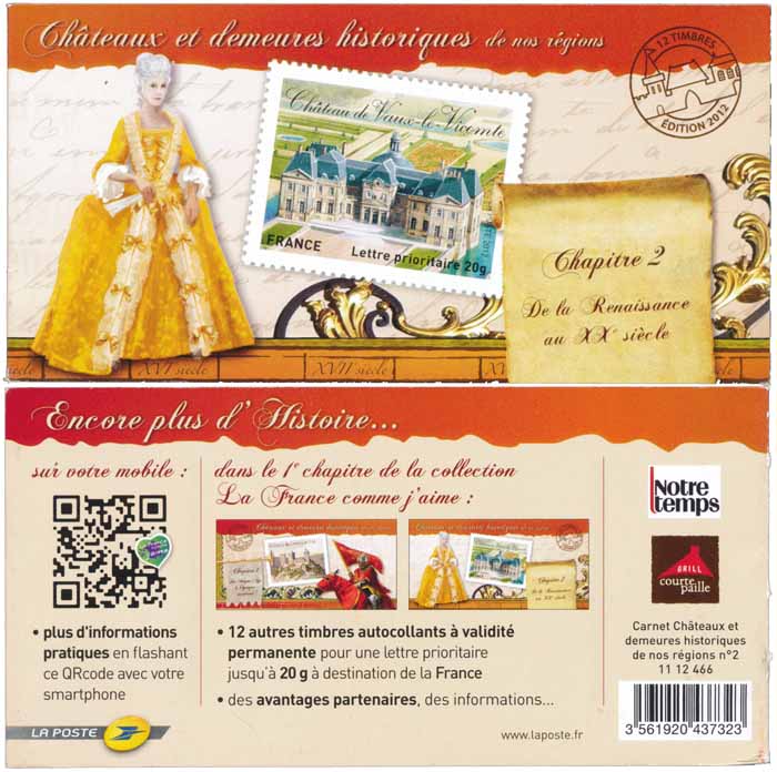 | Commentaire | Timbre à date “Premier Jour” conçu par Grenade. Émis lors du salon du timbre 2012 Le second carnet, également illustré par Stéphane Humbert- Basset, présente 12 châteaux et demeures, de la Renaissance au XXe siècle. Nous quittons les forteresses médiévales pour nous intéresser aux châteaux de la Loire, résidences raffinées des rois et princes de la Renaissance, aux châteaux baroques du siècle de Louis XIV, pour terminer avec d’extraordinaires villas des XIXe et XXe siècles. Ces deux carnets vous invitent à un parcours enchanteur dans nos régions, nos parcs régionaux, et vous raconte les petites histoires des demeures et des personnages qui incarnent l’histoire de France. Vous trouverez, à la fin des carnets, un coupon à remettre à un ami ou parent qui souhaite en savoir plus sur les timbres. |