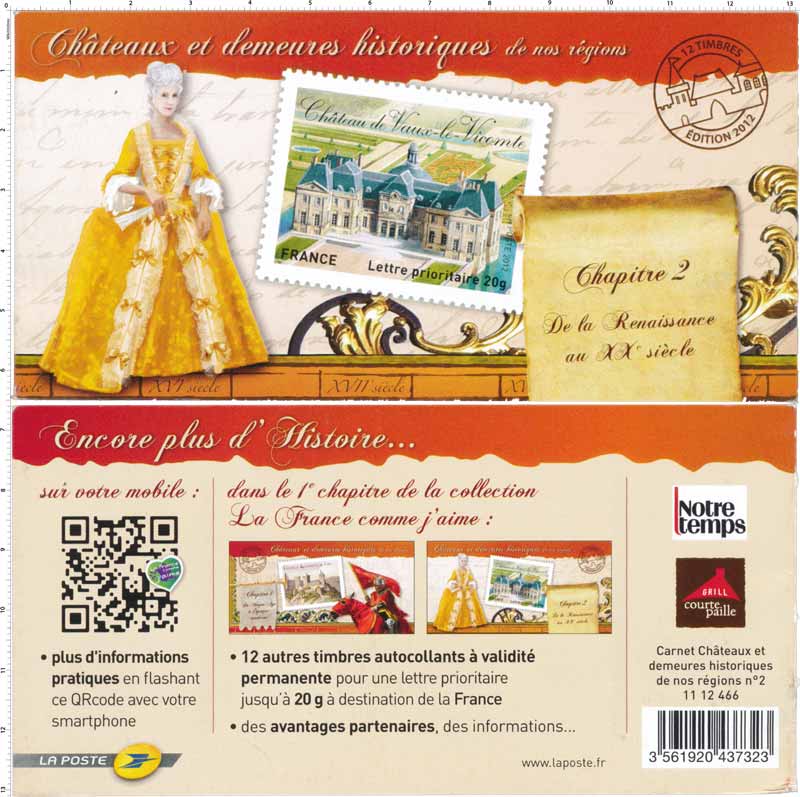 | Commentaire | Timbre à date “Premier Jour” conçu par Grenade. Émis lors du salon du timbre 2012 Le second carnet, également illustré par Stéphane Humbert- Basset, présente 12 châteaux et demeures, de la Renaissance au XXe siècle. Nous quittons les forteresses médiévales pour nous intéresser aux châteaux de la Loire, résidences raffinées des rois et princes de la Renaissance, aux châteaux baroques du siècle de Louis XIV, pour terminer avec d’extraordinaires villas des XIXe et XXe siècles. Ces deux carnets vous invitent à un parcours enchanteur dans nos régions, nos parcs régionaux, et vous raconte les petites histoires des demeures et des personnages qui incarnent l’histoire de France. Vous trouverez, à la fin des carnets, un coupon à remettre à un ami ou parent qui souhaite en savoir plus sur les timbres. |