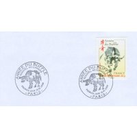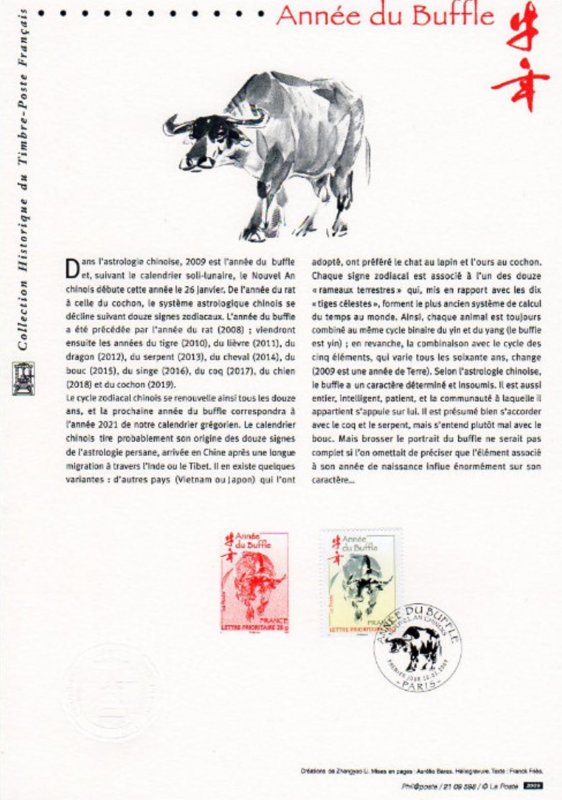 | Commentaire | La mise en vente anticipée a lieu les 10 et 11 janvier à Paris. Un troisième buffle, d'Aurélie Baras, orne le cachet premier jour. De l’année du rat à l’année du cochon, le système astrologique chinois comprend douze signes zodiacaux. Le cycle du zodiaque chinois se renouvelle ainsi tous les douze ans, le signe du buffle étant le deuxième. Celui-ci est décrit comme étant courageux et travailleur. Un fond de saules-pleureurs illustre ce bloc composé de 5 timbres-poste. |