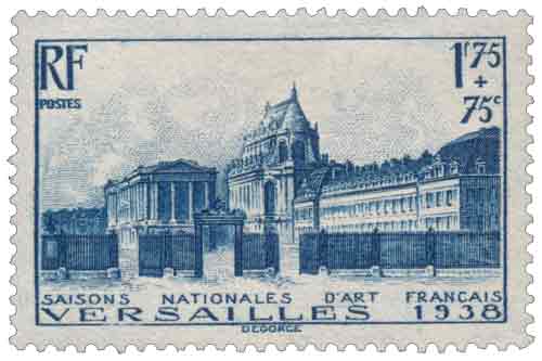 Émis le 9 mai 1938, ce timbre horizontal bleu célèbre l'événement culturel des "Saisons nationales d'art français" tenues au Château de Versailles. Il met en valeur l'un des monuments les plus emblématiques de l'histoire et du patrimoine français.