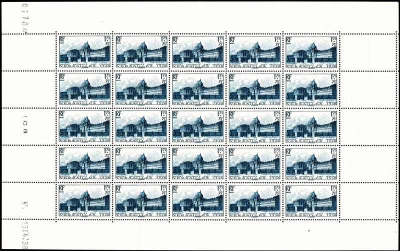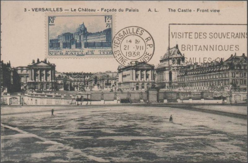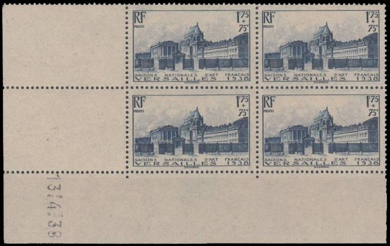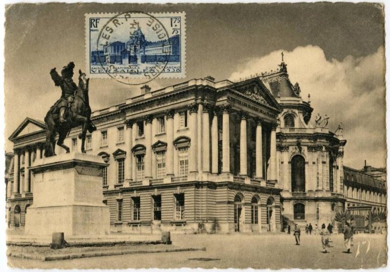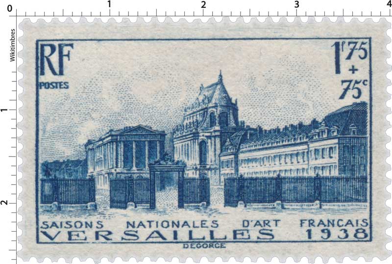 Émis le 9 mai 1938, ce timbre horizontal bleu célèbre l'événement culturel des "Saisons nationales d'art français" tenues au Château de Versailles. Il met en valeur l'un des monuments les plus emblématiques de l'histoire et du patrimoine français.
