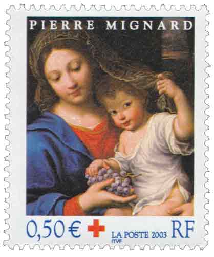 | Commentaire | Description synthétique du visuel du timbre Un détail de l’œuvre « La Vierge à la grappe » de Pierre Mignard illustre le timbre émis en carnet pour la Croix-Rouge Française. Pierre Mignard (Ier) dit Mignard le Romain, portraitiste, peintre d’histoire et miniaturiste, est né à Troyes le 17 novembre 1612, et mort à Paris en 1695. Ce timbre est grevé d'une surtaxe au profit de la Croix Rouge française |