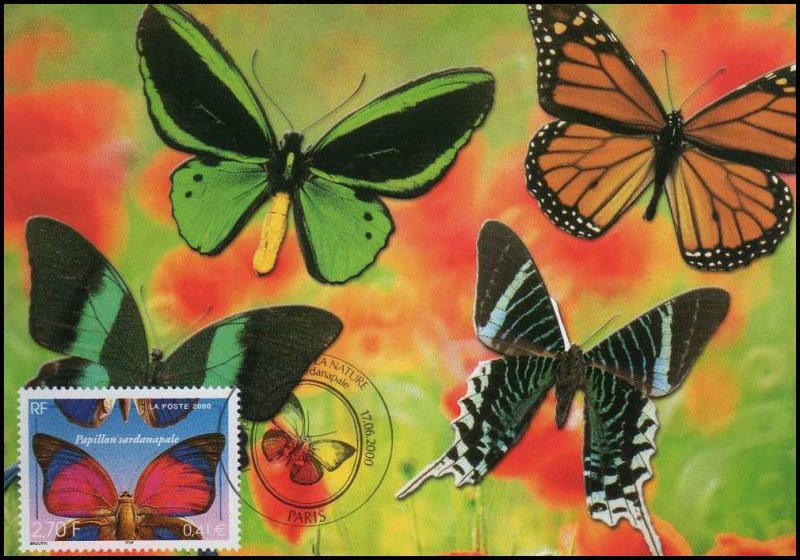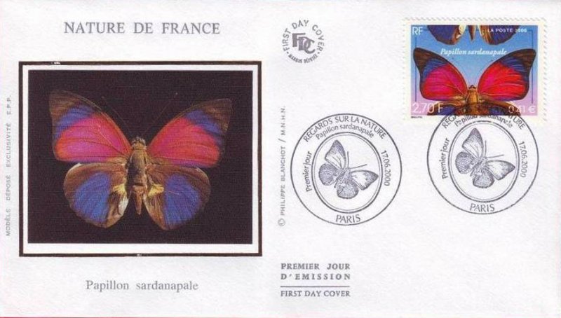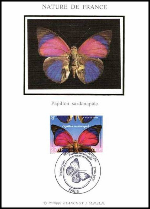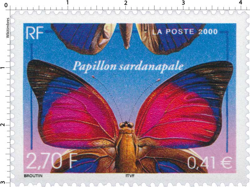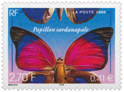 | Commentaire | Description synthétique du visuel du timbre : Les papillons (Lépidoptères, nom scientifique de l’ordre des papillons) se divisent en plusieurs familles. Le papillon sardanapale appartient à l’une des plus importantes de ces familles : les Nymphalidés (Nymphalidae). C’est un papillon diurne, tropical vivant en Amérique de Sud aux couleurs chatoyantes. Ce papillon, présenté dans les collections du Muséum, témoigne de la richesse et de la diversité de la nature. Le procédé graphique consistant à tronquer le sujet pour en répartir sa représentation sur deux timbres, contribue à créer un concept très original. le Sardanapale ne marche que sur quatre pattes, car les pattes antérieures sont atrophiées. Chez le mâle, celles-ci sont garnies de longues soies denses, comme un pinceau. |