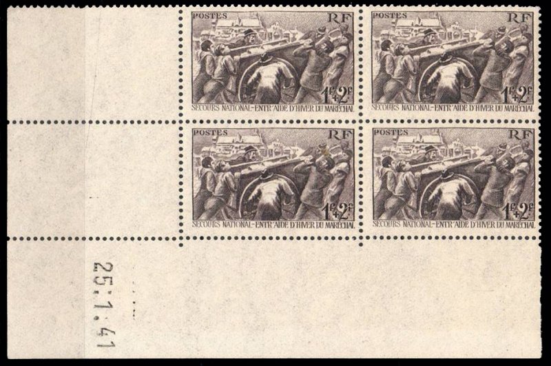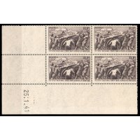 | Commentaire | Secours National - Transport du charbon, entre aide d'hiver du Maréchal. Démonétisé le :01/11/1944 Le timbre Secours National - Transport du charbon, mis en vente générale le 4 mars 1941, appartient à la série de bienfaisance dite de l'Entr'aide d'hiver du Maréchal, destinée à soutenir les populations civiles durant les mois de pénurie sous l'Occupation. L'œuvre, dessinée et gravée par Achille Ouvré, illustre avec réalisme le chargement du charbon, une thématique soulignant l'importance vitale du combustible dans le contexte des hivers rigoureux de guerre. Cette figurine présente une valeur faciale de 1,00 franc, correspondant au tarif de la lettre simple pour l'intérieur, complétée d'une importante surtaxe de 2,00 francs au profit du Secours National. Imprimé en taille-douce rotative sur la presse n° 4 en feuilles de 50 exemplaires, le timbre arbore une couleur violet-brun profonde. Bien que le tirage initial ait été de 1,16 million d'unités, seule une part d'environ 600 000 exemplaires a été effectivement vendue avant le retrait de la vente le 17 août 1941. Cette pièce de grand format horizontal (36x21,45 mm) avec une dentelure 13 est particulièrement recherchée avec ses coins datés, témoins de l'effort de propagande sociale et de solidarité nationale orchestré par le régime de Vichy. |