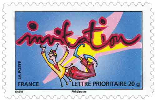 | Commentaire | La mise en vente anticipée a lieu le 5 septembre au Jardin d'acclimatation de Paris. Salvi reprend un de ses personnages en plein saut pour illustrer le cachet premier jour. « votre bonne humeur », « vos bonnes nouvelles », « votre enthousiasme », « vos envols », « vos fantaisies », « votre joie de vivre », « vos mots doux », « vos mystères », « votre patience », « vos promesses », « vos secrets », « vos surprises » ou « tous vos élans ». Timbre sans millésime |