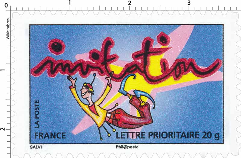 | Commentaire | La mise en vente anticipée a lieu le 5 septembre au Jardin d'acclimatation de Paris. Salvi reprend un de ses personnages en plein saut pour illustrer le cachet premier jour. « votre bonne humeur », « vos bonnes nouvelles », « votre enthousiasme », « vos envols », « vos fantaisies », « votre joie de vivre », « vos mots doux », « vos mystères », « votre patience », « vos promesses », « vos secrets », « vos surprises » ou « tous vos élans ». Timbre sans millésime |