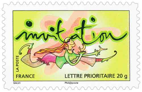 | Commentaire | La mise en vente anticipée a lieu le 5 septembre au Jardin d'acclimatation de Paris. Salvi reprend un de ses personnages en plein saut pour illustrer le cachet premier jour. « votre bonne humeur », « vos bonnes nouvelles », « votre enthousiasme », « vos envols », « vos fantaisies », « votre joie de vivre », « vos mots doux », « vos mystères », « votre patience », « vos promesses », « vos secrets », « vos surprises » ou « tous vos élans ». Timbre sans millésime |