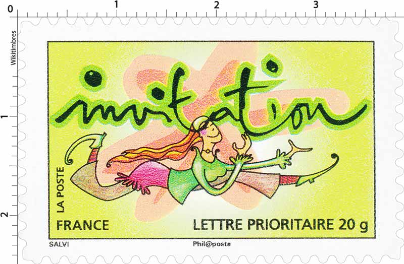 | Commentaire | La mise en vente anticipée a lieu le 5 septembre au Jardin d'acclimatation de Paris. Salvi reprend un de ses personnages en plein saut pour illustrer le cachet premier jour. « votre bonne humeur », « vos bonnes nouvelles », « votre enthousiasme », « vos envols », « vos fantaisies », « votre joie de vivre », « vos mots doux », « vos mystères », « votre patience », « vos promesses », « vos secrets », « vos surprises » ou « tous vos élans ». Timbre sans millésime |