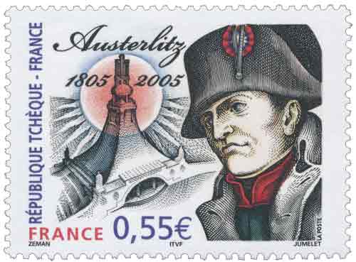 | Commentaire | Pour l’émission commune France-République tchèque, la thématique retenue pour illustrer le timbre de chaque pays est le bicentenaire de la Bataille d’Austerlitz. Le timbre français reprendra le Monument de la Paix, monument érigé sur le lieu de la bataille, et le portrait de Napoléon 1er.Émission conjointe avec la République Tchèque. |