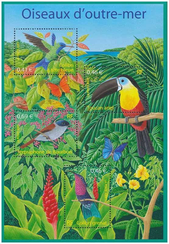| Commentaire | Oiseaux d’outre-mer Description synthétique du visuel du timbre : Ce bloc a pour thème les oiseaux protégés des départements d’outre-mer. Quatre oiseaux (1 oiseau par département) évoluent dans une ambiance évoquant la forêt tropicale : le colibri à tête bleue (cyanophaia bicolor), Martinique - le toucan ariel (Ramphastos vitellinus), Guyane - le terpsiphone de Bourbon (terpsiphone bourbonnensis), Réunion et le colibri grenat (eulampis jugularis), Guadeloupe. |