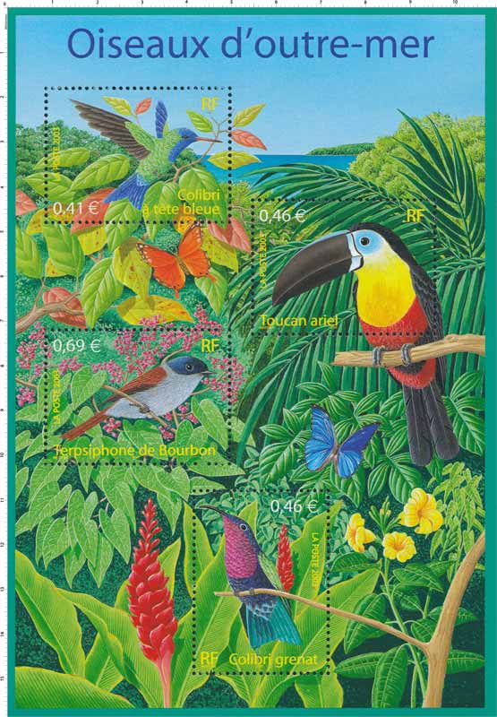 | Commentaire | Oiseaux d’outre-mer Description synthétique du visuel du timbre : Ce bloc a pour thème les oiseaux protégés des départements d’outre-mer. Quatre oiseaux (1 oiseau par département) évoluent dans une ambiance évoquant la forêt tropicale : le colibri à tête bleue (cyanophaia bicolor), Martinique - le toucan ariel (Ramphastos vitellinus), Guyane - le terpsiphone de Bourbon (terpsiphone bourbonnensis), Réunion et le colibri grenat (eulampis jugularis), Guadeloupe. |