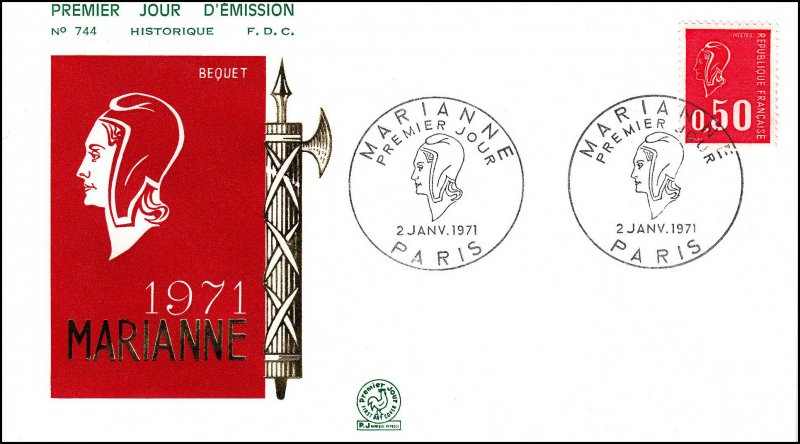 | Commentaire | Le 2 janvier est émis une nouvelle Marianne, dite Marianne de Béquet. Cette dernière est émise NON surchargée de bandes phosphorescentes. De même une roulette au même type est mise en vente. Ce n'est que dans le courant du mois de février 1971 qu'est mis en vente la Marianne de Béquet surchargée de trois bandes phosphorescentes. La poste testait une nouvelle machine de tri. Cette émission n'est pas passée pour confidentielle, comme le fut l'émission des trois timbres surchargés de bandes phosphorescentes en 1970, où seule la région de Clermont-Ferrand fut concernée! De plus des essais grandeur nature ont été testés avec ce timbre surchargé des trois bandes phosphorescentes. Un nombre de bandes inférieures ou égales à 2 bandes lues par la machine indiquait un courrier dit lent et était traité comme courrier non prioritaire. Un nombre de bandes supérieur à 2 bandes (3 en l'occurrence) lues par la machine indiquait un courrier dit rapide, et était traité prioritairement. |