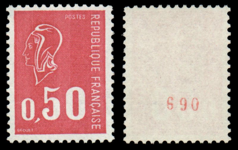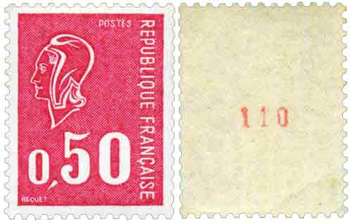 | Description | Type Marianne de Béquet. Émis en roulette de 1000 timbres avec numéro rouge au dos tous les 10 timbres |