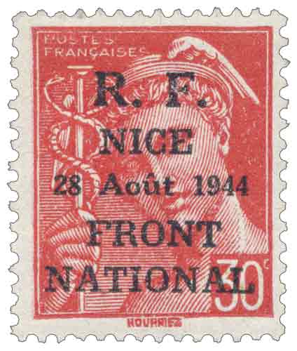 | Description | Type Mercure, surcharge R.F. surchargé R.F. NICE 28 août 1944 FRONT NATIONAL |