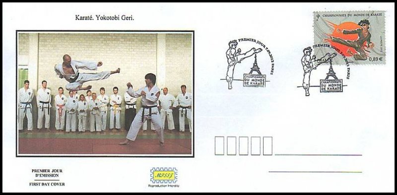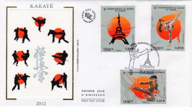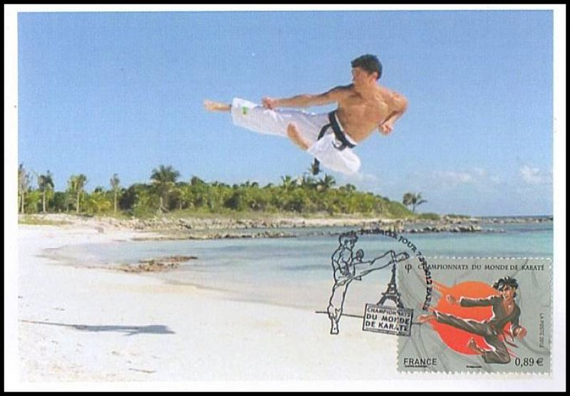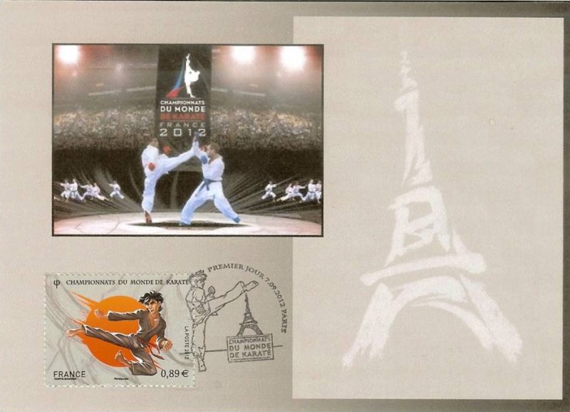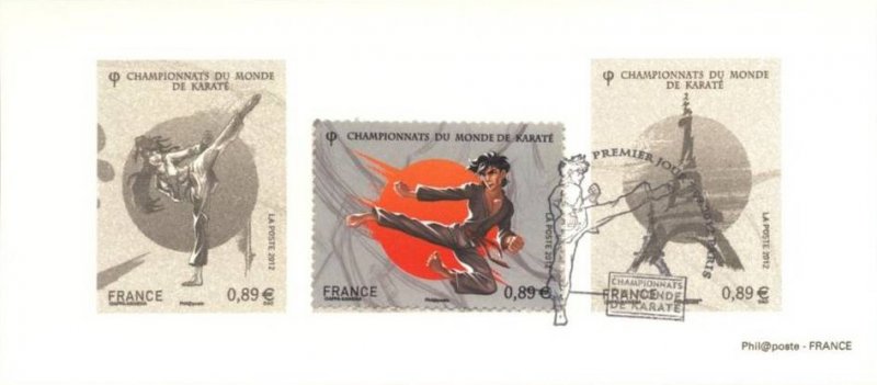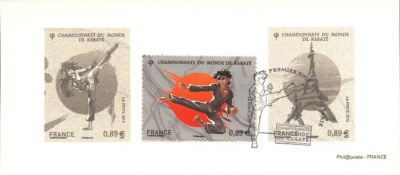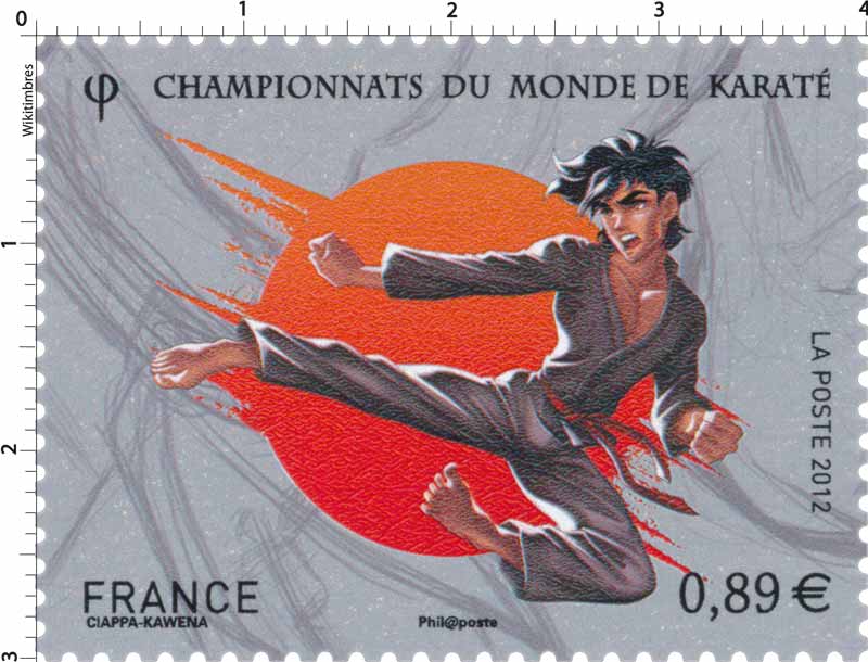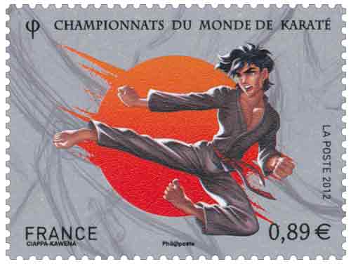 | Commentaire | L'idéogramme sur la gauche est en couleur argent Art de combat à mains nues, le karaté-do comprend des techniques offensives et défensives utilisant toutes les parties du corps. Le “do”, voie de la connaissance nous enseigne le comportement juste envers son partenaire d’entraînement, mais aussi envers soi-même. De nombreuses écoles rassemblant des millions de personnes sont aujourd’hui présentes sur les cinq continents. La 21e édition des championnats du monde de karaté se déroule du 21 au 25 novembre 2012 au Palais Omnisports de Paris Bercy. À cette occasion, La Poste émet un bloc 3 de timbres-poste, dessinés façon “manga”. La jeune fille sur le timbre de gauche réalise un MAWASHI GERI et le garçon sur le timbre de droite réalise un YOKO TOBI GERI. L’idéogramme sur la gauche du timbre se nomme KARATÉ-DO, ce qui signifie : KARA : vide, TÉ : main, DO : voie.