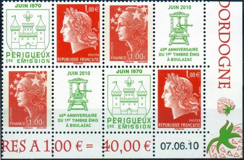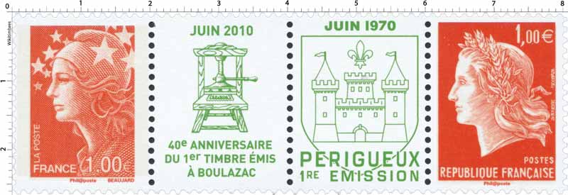 | Description | Paire, Marianne de Beaujard et de de Cheffer, 40e anniversaire du premier timbre émis à Boulazac (Dordogne) |