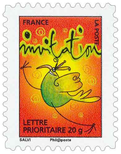 | Commentaire | La mise en vente anticipée a lieu le 5 septembre au Jardin d'acclimatation de Paris. Salvi reprend un de ses personnages en plein saut pour illustrer le cachet premier jour. « votre bonne humeur », « vos bonnes nouvelles », « votre enthousiasme », « vos envols », « vos fantaisies », « votre joie de vivre », « vos mots doux », « vos mystères », « votre patience », « vos promesses », « vos secrets », « vos surprises » ou « tous vos élans ». Timbre sans millésime |