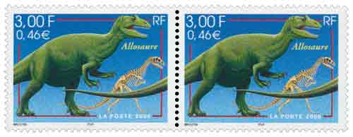 | Commentaire | Description synthétique du visuel du timbre : Avec le Jurassique (de – 208 millions d’années à – 144 millions d’années), commence véritablement l’âge d’or des dinosaures. L’Allosaure, mesurant onze mètres de long et pesant deux tonnes, fut l’un des plus grands carnivores du Jurassique. L’allosaure dont le squelette est conservé dans la Galerie de paléontologie du Muséum national d’histoire naturelle, témoigne de la richesse et de la diversité de la nature. Le procédé graphique consistant à tronquer le sujet pour en répartir sa représentation sur deux timbres, contribue à créer un concept très original. |