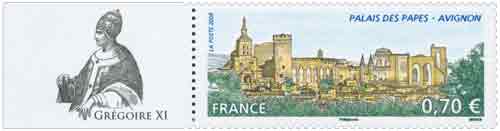 La manifestation premier jour, dont le timbre à date de Claude Perchat représente les armes du pape Clément VI, a lieu les 7 et 8 mars au palais, à Avignon. Construit à partir de 1335, principalement par les deux papes bâtisseurs, Benoît XII et Clément VI, le Palais des Papes est le symbole du rayonnement de l'Église sur l’Occident chrétien au XIVe siècle. Entouré de remparts imposants, flanqué de quatre tours gigantesques, le monument est aujourd'hui le plus grand palais gothique du monde, et l'un des plus visité des monuments historiques en France. Il constitue - avec le Pont Saint Bénezet, les Remparts, le Petit Palais et la cathédrale des Doms - un ensemble architectural unique classé Patrimoine Mondial de l'Humanité par l'Unesco. Outre la visite de lieux riches d’histoire (fresques, appartements...), le Palais des Papes offre est aussi le siège de nombreux et célèbres événements culturels, dont le Festival d'Avignon créé par Jean Vilar en 1947.