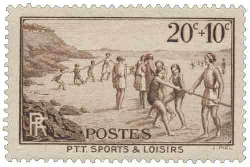 | Commentaire | PTT Sports et Loisirs - Jeux de plage. Fédération des Sociétés Postales de Mutualité : aider les oeuvres sociales dont l'action tend à l'amélioration générale de l'état sanitaire du personnel. La surtaxe de 10 centimes était destinée : 50% pour financer l'ASPTT (construction du stade de Pantin) - 35% pour subventionner les auberges de loisirs des PTT - pour 15% les colonies de vacances des enfants des personnels des PTT. Le timbre français Yvert et Tellier n°345, émis en 1937, est le premier d'une courte série de bienfaisance conçue pour soutenir les œuvres sociales et sportives des P.T.T.. Dessiné et gravé en taille-douce par Jules Piel, cette vignette illustre les Plaisirs de la Plage, un thème léger contrastant avec la gravité de la crise économique et sociale des années 1930. Faisant partie d'une émission de seulement 1,5 million d'exemplaires pour la série, ce timbre était un surtaxé dont le montant additionnel finançait directement l'amélioration sanitaire du personnel, les auberges de jeunesse, et l'Association sportive des PTT, notamment pour l'acquisition d'installations comme le stade de Pantin. Il représente un jalon important de la philatélie française moderne, où les émissions spéciales sont de plus en plus utilisées pour financer des causes d'intérêt général, une pratique courante pour les timbres PTT Sports de cette décennie. Son utilisation témoigne des tarifs postaux en vigueur en 1937, tout en documentant les prémices du mouvement des loisirs et des congés payés. |