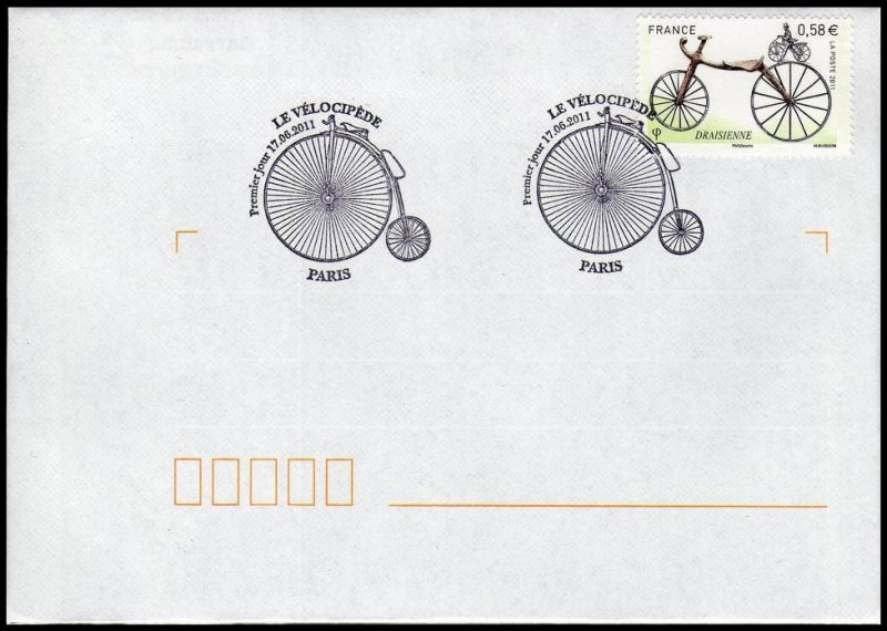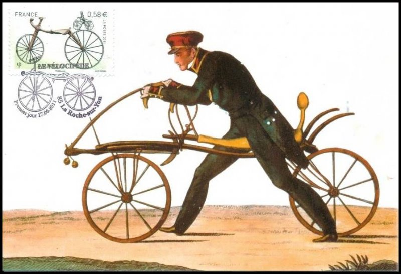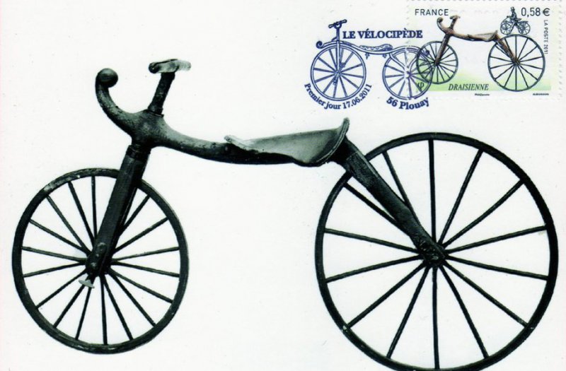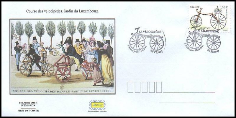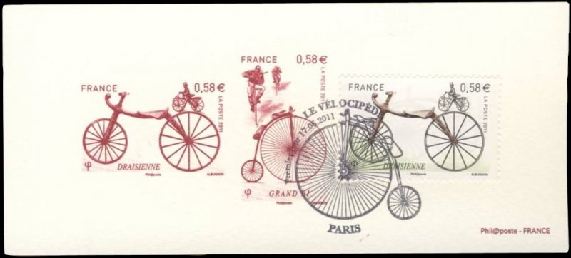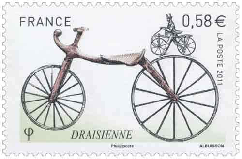 | Commentaire | Les six timbres du bloc Coin des collectionneurs 2011 retracent Les différentes étapes de L'histoire de La bicyclette, de La draisienne au vélo. La draisienne, commercialisée en France en 1817 sous Le nom de vélocipède, n'avait ni pédale ni guidon. Il faut attendre 1861 pour que Pierre Michaux invente La pédivelle et crée une entreprise de fabrication de vélocipèdes à pédales. Ils sont ensuite perfectionnés en Angleterre où apparaissent en 1872 Le grand bi et sa roue géante puis, en 1885, Les mécanismes de transmission par chaîne du pédalier à La roue et Les engrenages qui permettent de gagner en vitesse tout en réduisant La taille de La roue. Dans Les années qui suivent, Les courses et Les exploits se multiplient, comme Le premier Paris Brest- Paris remporté par Charles Terront après 71 heures d'effort. Aujourd'hui, Le vélo de ville, moyen de transport alternatif à faible empreinte écologique, connait un nouvel essor |