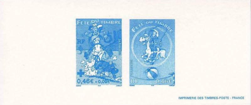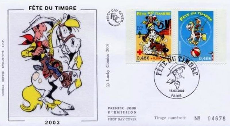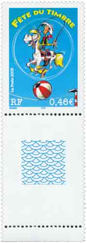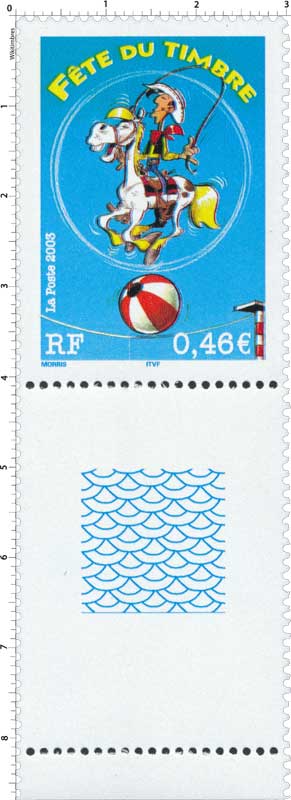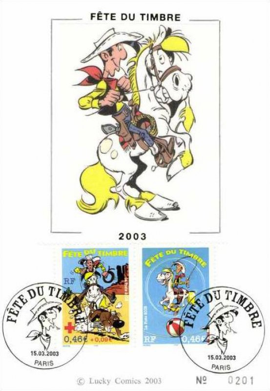 | Description | Fête du timbre 2003. Lucky Luke, effectuant un numéro de funambulisme avec son cheval Jolly Jumper. 2 bandes de phosphore. (provenant d'une feuille de 40 TP) |