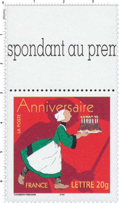 Il était légitime que Bécassine, qui fêtera ses 100 ans en 2005, illustre cette année là le timbre Anniversaire. Ce personnage à la bouille ronde surmontée d’une coiffe à ailettes, vêtu d’un tablier blanc sur une robe vert pomme et doté d’un parapluie rouge a été imaginé par Pinchon pour le journal La semaine de Suzette. Le personnage y accompagnait les textes de Caumery (pseudonyme de Maurice Languereau,