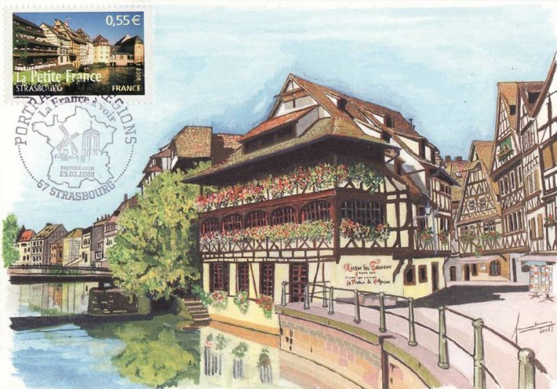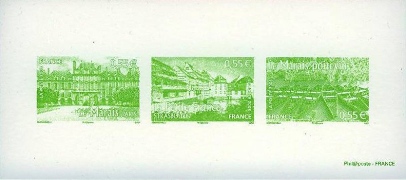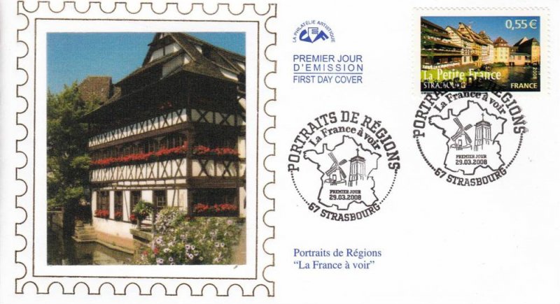 | Commentaire | BF117. Bloc de dix timbres de 0,55 euro La mise en vente anticipée du bloc a lieu dans plusieurs villes concernées par le sujet des timbres : Castelnaudary, Coulon, Honfleur, Paris, Perros-Guirec, Rigny-Ussé, Salazie, Sarlat-la-Canéda, Strasbourg et Vézelay. Le cachet premier jour représente une carte de la France métropolitaine sur laquelle figure un moulin et un clocher. |