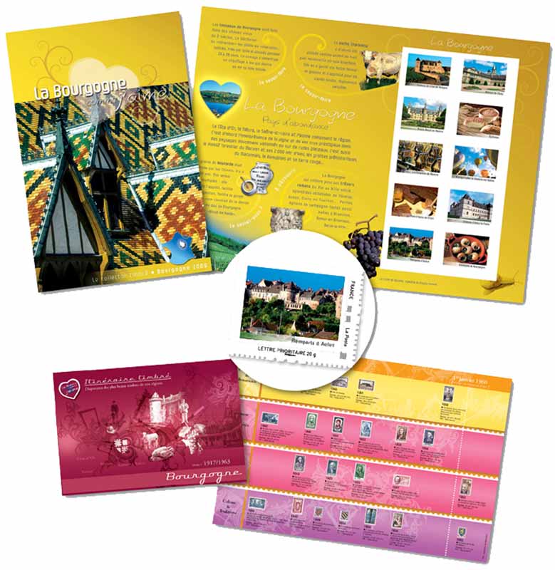 | Commentaire | 20 g France - Le collector timbré régional (22 régions+ 1 collector spécial Paris + 1 collector Antilles) = 24Château du Clos de Vougeot (Côte d’Or): un haut –lieu de la promotion internationale des vins et de la gastronomie au cœur du vignoble bourguignon. Abbaye de Cluny (Saône-et-Loire) : le berceau du renouveau monastique en Occident dès le Xe siècle. Palais Ducal de Nevers (Nièvre) : château des Ducs de Nevers et de la famille des Gonzague, édifié aux XV e siècle, classé Monument Historique Époisses : un fromage à la croûte orangée, fabriqué et affiné dans une région limitée, s'étendant sur une large partie ouest de la Côte d'Or, et dans quelques cantons de l'Yonne et de la Haute-Marne. Les Hospices de Beaune (Côte d’Or) : remarquables par leurs toits vernissés et célèbres pour abriter des ventes aux enchères de grands crus de Bourgogne. Montgolfiades de Châlon-sur-Saône (Sâone-et-Loire): une manifestation spectaculaire qui réunit chaque année à Pentecôte, les amateurs de montgolfières. Pain d’épice de Dijon (Côte d’Or) : une spécialité gourmande de la ville depuis le XIVe siècle. Château d’Ancy –le - Franc (Yonne) : construit au XVIe siècle, il abrite de superbes peintures murales, plafonds à caisson, boiseries finement sculptées Remparts d’Autun (Saône-et-Loire) : les mieux conservés de la Gaule romaine. Escargots de Bourgogne : un des meilleurs ambassadeurs de la gastronomie de la région |