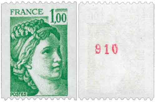 | Commentaire | Sabine de Gandon, type I. Roulette de 1000 timbres numérotée en rouge au dos tous les 10 timbres. Le premier numéro est 000, le dernier est 010. La gomme est mate ou dite tropicale. |