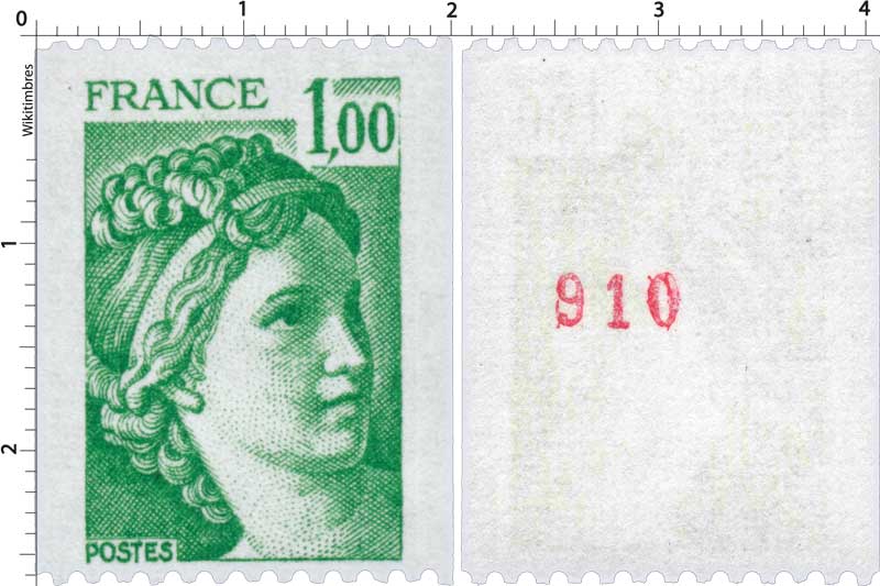 | Commentaire | Sabine de Gandon, type I. Roulette de 1000 timbres numérotée en rouge au dos tous les 10 timbres. Le premier numéro est 000, le dernier est 010. La gomme est mate ou dite tropicale. |
