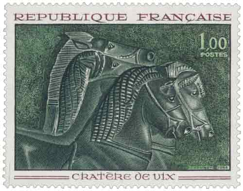 | Commentaire | Émis en 1966, le timbre consacré au Cratère de Vix illustre l’un des objets majeurs de l’archéologie européenne, découvert en 1953 dans une tombe princière du premier âge du Fer à Vix, au pied du mont Lassois, site stratégique contrôlant les voies de circulation de la vallée de la Seine, et met en lumière un chef-d’œuvre de bronze grec daté du VIe siècle av. J.-C., attribué à des ateliers d’Italie méridionale (probablement Cumes ou Tarente), dont les dimensions exceptionnelles — plus de 1,60 m de haut, plus de 1 100 litres de capacité — et la qualité de fabrication en font le plus grand vase métallique connu de l’Antiquité, tandis que sa frise appliquée de chars de guerre, hoplites casqués et chevaux, obtenue selon la technique de la cire perdue, témoigne de l’excellence de l’art grec archaïque et des échanges à longue distance entre élites celtiques et mondes méditerranéens, le timbre reprenant précisément un détail de cette frise afin d’insister sur la finesse du modelé et la lisibilité narrative du décor, choix iconographique cohérent avec la vocation commémorative et éducative de l’émission, qui s’inscrit dans une série valorisant le patrimoine artistique et archéologique conservé en France, tout en rappelant l’usage rituel et symbolique de ces objets de prestige dans les pratiques funéraires aristocratiques celtes, sans spéculer sur la fonction exacte du vase mais en soulignant sa place centrale dans l’interprétation des réseaux commerciaux et culturels du Hallstatt final. |