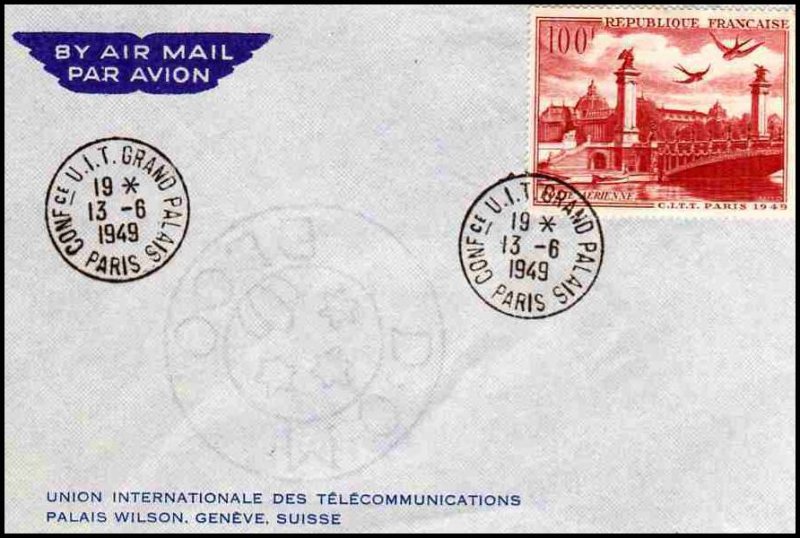 | Commentaire | Congrès international de télégraphie et de téléphonie. Paris. Visuel : La Conférence Internationale Télégraphique et Téléphonique de Paris, réunie sous l'égide de l'UIT (Union Internationale des Télécommunications) s'est tenue du 15 juin au 3 juillet 1949. Elle avait notamment pour but de rechercher une harmonisation internationale des tarifs, des codifications, des transports et de la comptabilité des télégrammes et radiotélégrammes internationaux. Elle faisait suite aux Conventions Internationales des Télécommunications qui s'étaient tenue à Madrid en 1932 et à Atlantic City en 1947. |