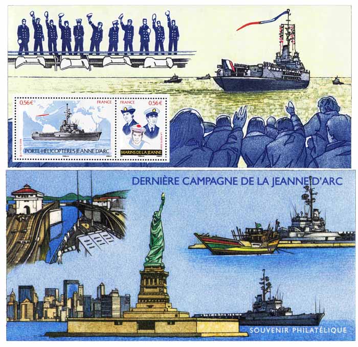| Commentaire | Retraite prévue en 2010 pour le porte-hélicoptères Jeanne d’Arc après 46 années de service. Pour sa dernière campagne, un hommage est rendu à ce navire-école au travers de ce souvenir qui illustre ses différentes destinations empruntées et le départ des familles face aux marins. Format ouvert du souvenir : 210 x 200 mm - Format du feuillet gommé : 205 x 95 mm |