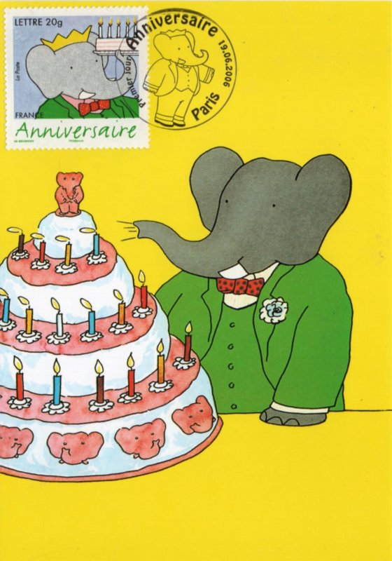 | Commentaire | En 2006, Babar fête ses 75 ans. Figure emblématique de la bande dessinée, créé par Jean de Brunhoff, puis repris par Laurent de Brunhoff, Babar incarne les valeurs fondamentales que sont la famille, la sagesse, le respect, l’écologie. Ce héros positif et aventureux est trans-générationnel et fait partie de la mémoire collective. Timbre sans millésime |