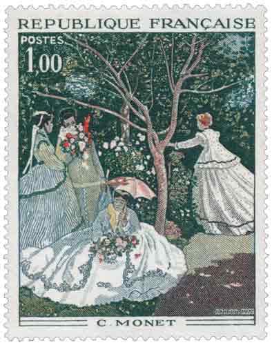 | Commentaire | Ce timbre-poste français émis en 1972 s’inscrit dans les émissions artistiques dites du « musée imaginaire » et reproduit Femmes au jardin, œuvre peinte en 1866-1867 par Claude Monet, tableau décisif des débuts de l’artiste et jalon fondateur de ce qui sera nommé l’impressionnisme à partir de 1874. Par cette figurine de grand format vertical, l’administration postale française met en circulation une image emblématique d’une recherche nouvelle sur la lumière et la couleur, réalisée en plein air, où les figures féminines élégantes se fondent dans un jardin baigné d’ombres et de clartés changeantes. Sur le plan philatélique, l’émission associe un usage postal réel, la valeur faciale de 1,00 franc étant destinée à l’affranchissement complémentaire, à une vocation culturelle affirmée, caractéristique des timbres français des années 1970 consacrés aux chefs-d’œuvre des musées nationaux. Dessiné et gravé en taille-douce par Pierre Gandon, le timbre restitue la composition ample et la touche fragmentée de l’original grâce à une impression polychrome en plusieurs passages, privilégiant la finesse du trait et la vibration des couleurs plutôt qu’une reproduction strictement photographique. Le choix de Femmes au jardin renvoie à une période de grande précarité pour Monet, alors engagé dans une rupture radicale avec l’enseignement académique et les pratiques d’atelier, au profit d’une observation directe des effets de lumière naturelle, quitte à employer des procédés techniques audacieux pour peindre une toile de très grand format en extérieur. Refusée au Salon de 1867, l’œuvre fut néanmoins reconnue rétrospectivement comme la première réalisation pleinement aboutie de la peinture impressionniste, tant par son sujet moderne que par son traitement pictural en touches colorées. En reproduisant ce tableau, le timbre rappelle le rôle essentiel de ces années d’expérimentation dans la constitution d’un mouvement qui transformera durablement l’histoire de la peinture et dont l’influence internationale demeure majeure. Article rédigé pour WikiTimbres |