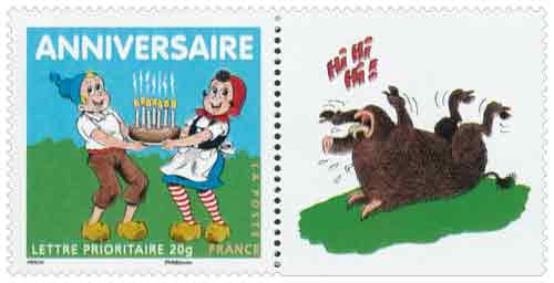 | Description | Timbre pour anniversaires. Sylvain et Sylvette, héros de la bande dessinée créée en 1941 par Maurice Cuvillier (1897-1957), né à Dormans (Marne). Les illustrations sont assurées de nos jours par Jean-Louis Pesch, personnalité de Juvardeil (Maine-et-Loire) |