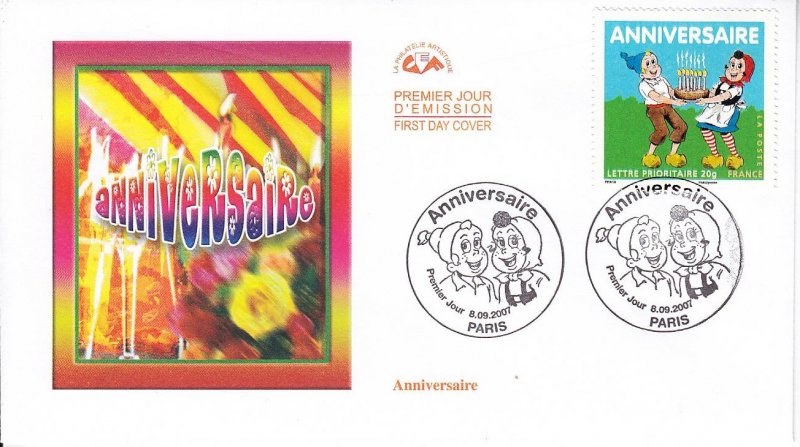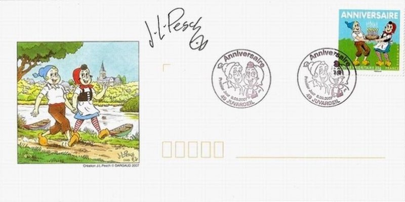 | Description | Timbre pour anniversaires. Sylvain et Sylvette, héros de la bande dessinée créée en 1941 par Maurice Cuvillier (1897-1957), né à Dormans (Marne). Les illustrations sont assurées de nos jours par Jean-Louis Pesch, personnalité de Juvardeil (Maine-et-Loire) |