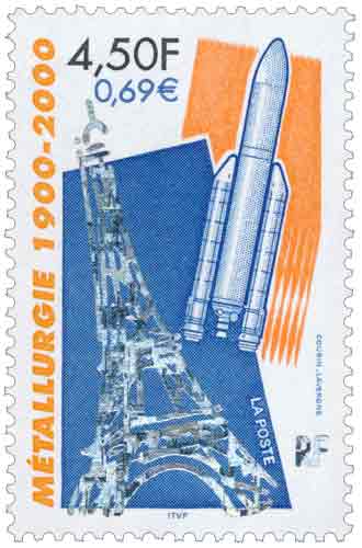 | Commentaire | Description synthétique du visuel du timbre : L’Union des Industries Métallurgiques et Minières célébrera en décembre 2000 le centenaire de sa naissance. Ce timbre honore l’importance du rôle des entreprises métallurgiques dans l’économie française. La métallurgie est l’art d’extraire les métaux de leurs minerais, d’élaborer des alliages, de les transformer en produits demi finis et de les mettre en forme pour leur utilisation (produits finis). La fusée Ariane incarne la métallurgie moderne. La représentation d’une Tour Eiffel, dont le caractère métallique est accentué par la pose d’une argenture à chaud, caractérise tout autant cette industrie. Le choix d’une impression en taille-douce est symbolique, par l’évocation des métaux traduite à travers les aciers gravés et les ustensiles (burin …). |
