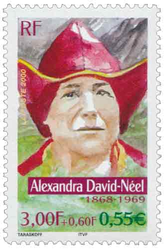 | Commentaire | Description synthétique du visuel du timbre : Aventurière au sens noble du terme, elle incarna plusieurs personnages dans sa vie : anarchiste, bourgeoise, écrivain, journaliste, cantatrice, et surtout bouddhiste et orientaliste. C’est au Sikkim, petit royaume himalayen, qu’elle a vécu les années les plus importantes de sa vie d’orientaliste. Elle fut aussi la première occidentale à entrer dans Lhassa au Tibet en 1924. Son visage surmonté de la coiffe bouddhiste, présenté sur un fond évoquant les monts tibétains, illustre le visuel. |