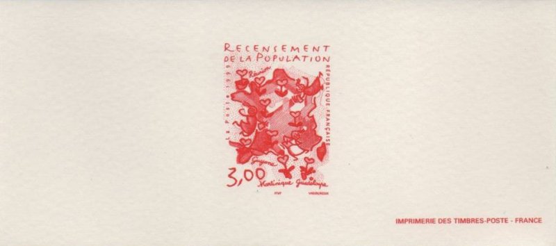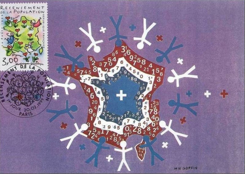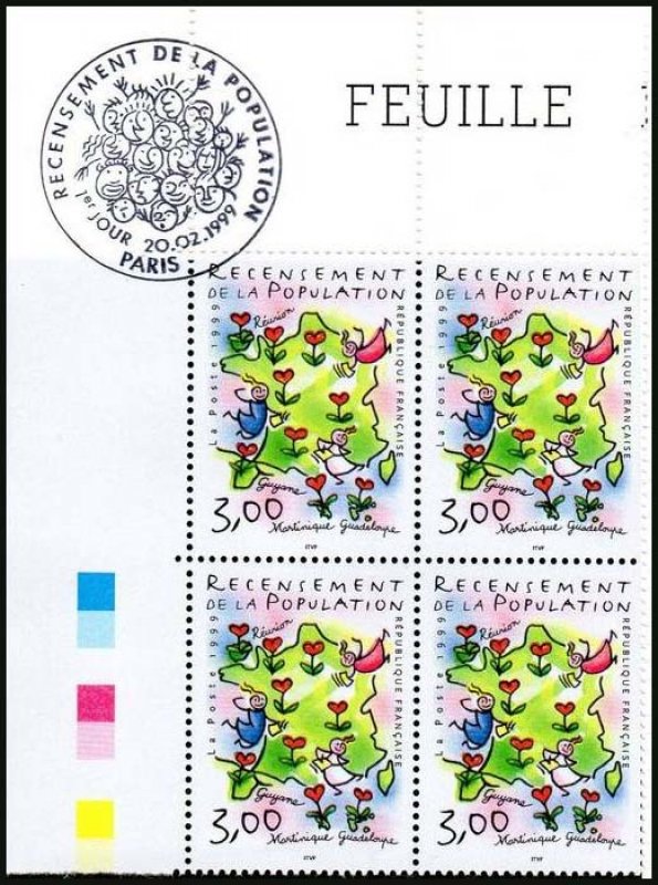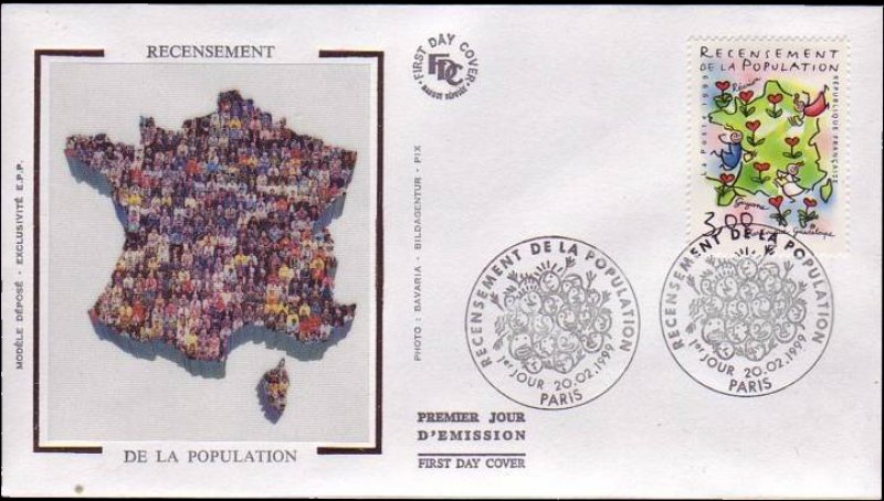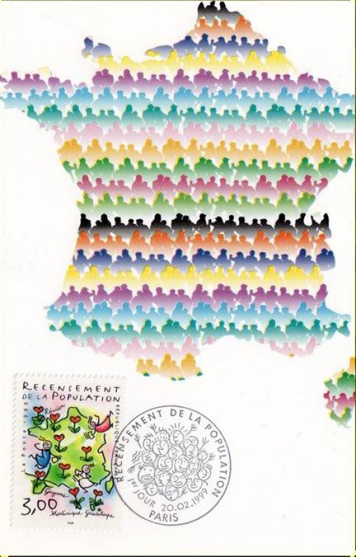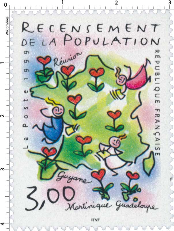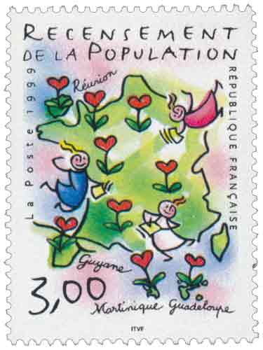 | Commentaire | Description synthétique du visuel du timbre : Le recensement de la population effectué par l’INSEE débutera le 8 mars 1999. Il a pour objectif de dénombrer la population vivant sur le sol français. Cette information servira de base aux études économiques, financières et administratives tant françaises qu’européennes. Le visuel valorise le devoir civique et la participation individuelle à une action d’intérêt général. Il représente des personnages munis d’imprimés symbolisant les divers acteurs (l’agent recenseur et la personne recensée) sur une image de la France (DOM y compris) aux couleurs douces. Chacune des fleurs symbolise une nouvelle vie éclose à recenser. |