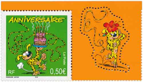 | Description | Timbre pour anniversaires. Marsupilami tenant un gâteau. Personnage de bande dessinée. |