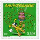 | Description | Timbre pour anniversaires. Marsupilami tenant un gâteau. Personnage de bande dessinée. |